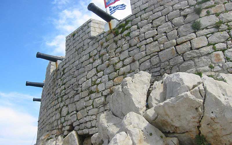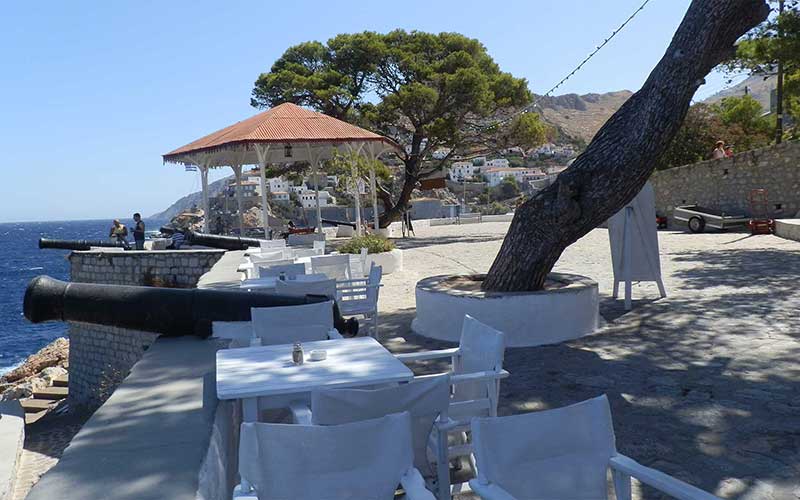 Δεξιά και αριστερά από την είσοδο του λιμανιού βρίσκονται οι Προμαχώνες με τα κανόνια που προστάτευαν παλαιότερα την πόλη, μαζί με την Προτομή του Ναυάρχου Ανδρέα Μιαούλη.
